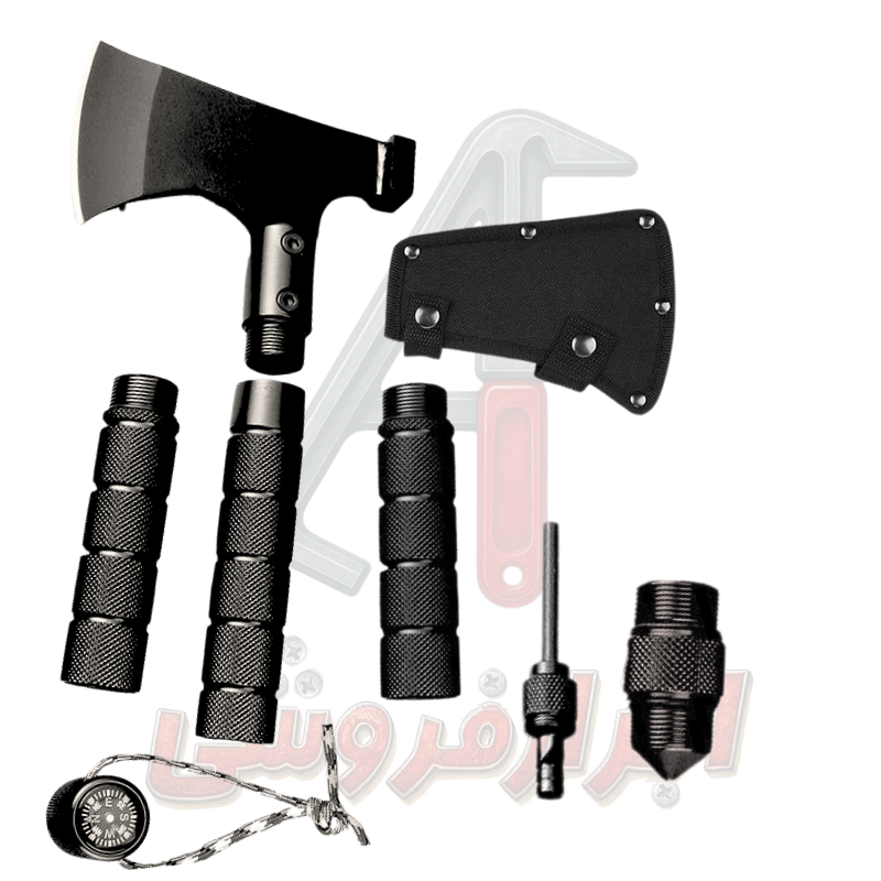 تبر، چکش، اره،چاقو، سوت، چخماق ، سر بازکن، ضربه زن در این محصول تعبیه شده است. این محصول تاشو می باشد و به راحتی می توان آن را حمل کرد.